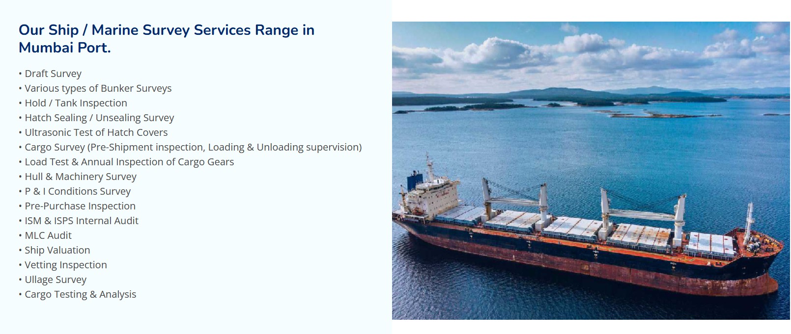 V-OCEAN is a well reputed, professionally managed, well established new generation equipped organization offering entire SHIP MARINE SURVEY solution to our clients in Mumbai Port.