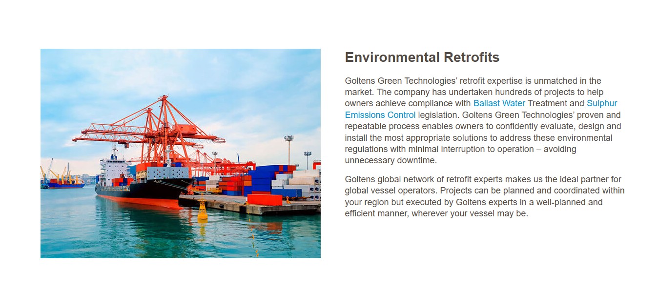 Goltens Green Technologies’ retrofit expertise is unmatched in the market. The company has undertaken hundreds of projects to help owners achieve compliance with Ballast Water Treatment and Sulphur Emissions Control legislation. Goltens Green Technologies’ proven and repeatable process enables owners to confidently evaluate, design and install the most appropriate solutions to address these environmental regulations with minimal interruption to operation – avoiding unnecessary downtime.