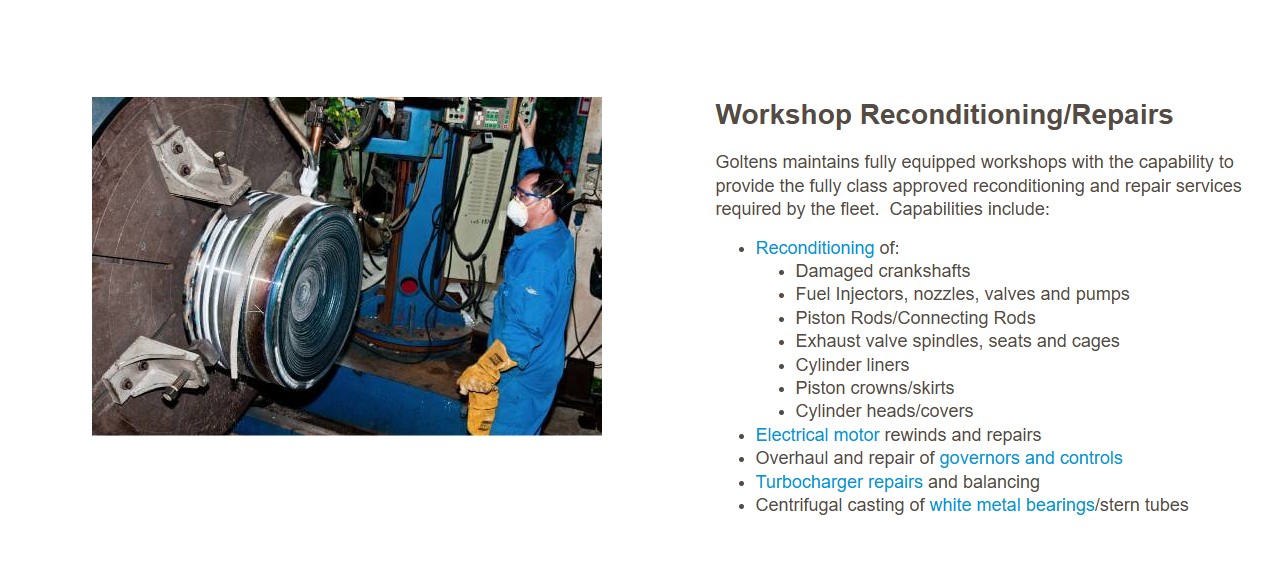Goltens maintains fully equipped workshops with the capability to provide the fully class approved reconditioning and repair services required by the fleet. Capabilities include: