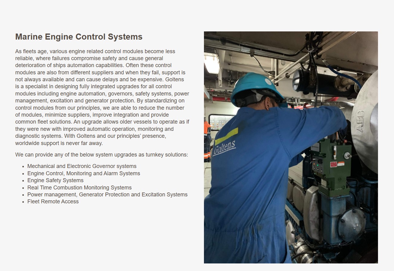 As fleets age, various engine related control modules become less reliable, where failures compromise safety and cause general deterioration of ships automation capabilities. Often these control modules are also from different suppliers and when they fail, support is not always available and can cause delays and be expensive. Goltens is a specialist in designing fully integrated upgrades for all control modules including engine automation, governors, safety systems, power management, excitation and generator protection. By standardizing on control modules from our principles, we are able to reduce the number of modules, minimize suppliers, improve integration and provide common fleet solutions. An upgrade allows older vessels to operate as if they were new with improved automatic operation, monitoring and diagnostic systems. With Goltens and our principles’ presence, worldwide support is never far away.