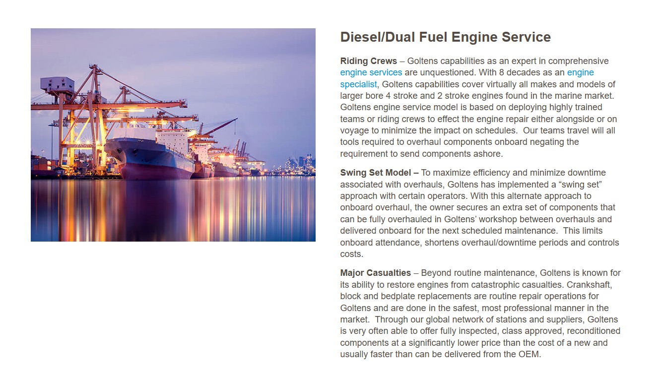 Riding Crews – Goltens capabilities as an expert in comprehensive engine services are unquestioned. With 8 decades as an engine specialist, Goltens capabilities cover virtually all makes and models of larger bore 4 stroke and 2 stroke engines found in the marine market. Goltens engine service model is based on deploying highly trained teams or riding crews to effect the engine repair either alongside or on voyage to minimize the impact on schedules. Our teams travel will all tools required to overhaul components onboard negating the requirement to send components ashore.