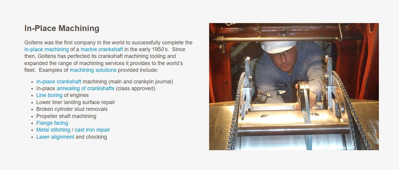 Goltens was the first company in the world to successfully complete the in-place machining of a marine crankshaft in the early 1950’s. Since then, Goltens has perfected its crankshaft machining tooling and expanded the range of machining services it provides to the world’s fleet. Examples of machining solutions provided include: