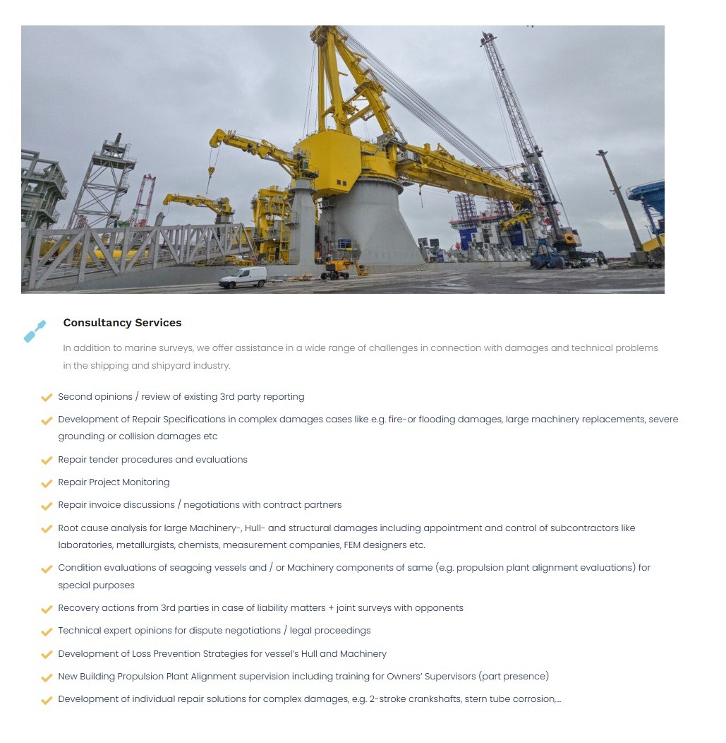 In addition to marine surveys, we offer assistance in a wide range of challenges in connection with damages and technical problems in the shipping and shipyard industry.