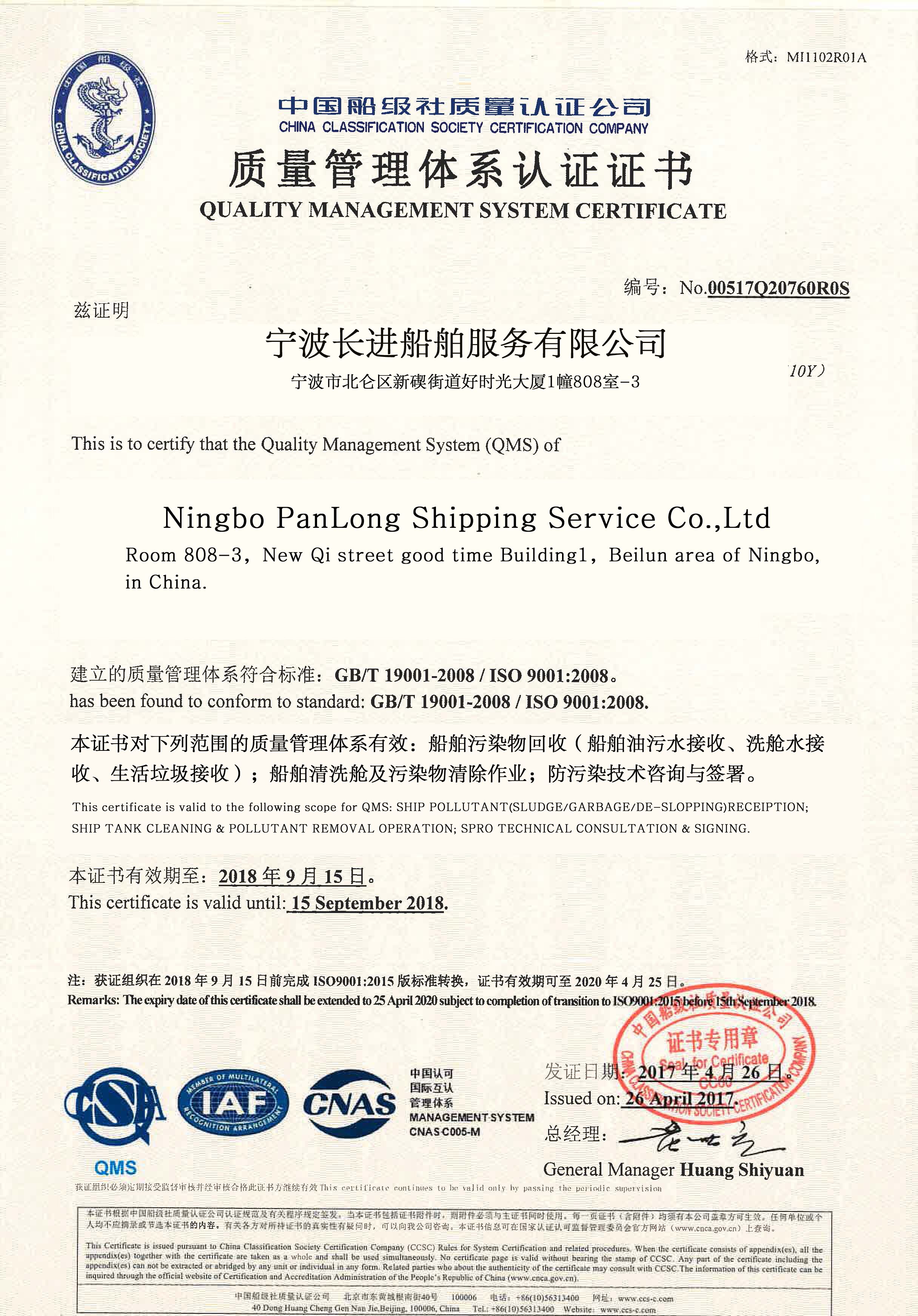 Ningbo Changjin Ship Service Co., Ltd., established in 2013, is a professional ship service company approved and recognized by the national competent authorities, and is authorized to carry out services such as receiving ship oil and wastewater, receiving tank cleaning water, cleaning tanks and removing and treating pollutants, and providing pollution prevention technical consulting in various ports in China.